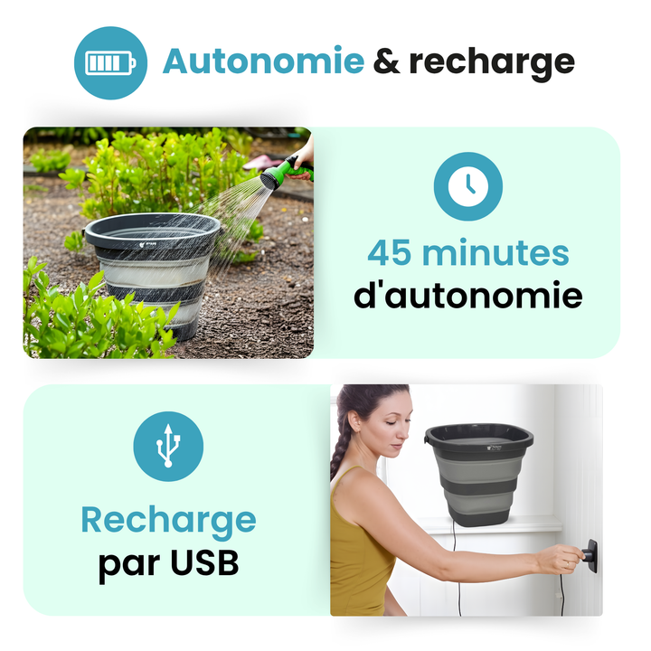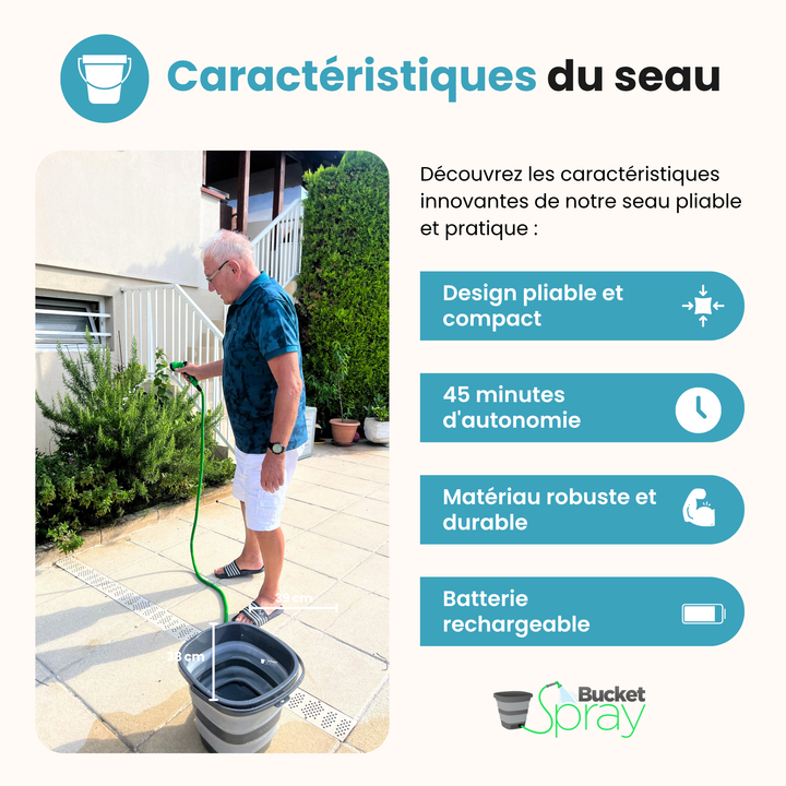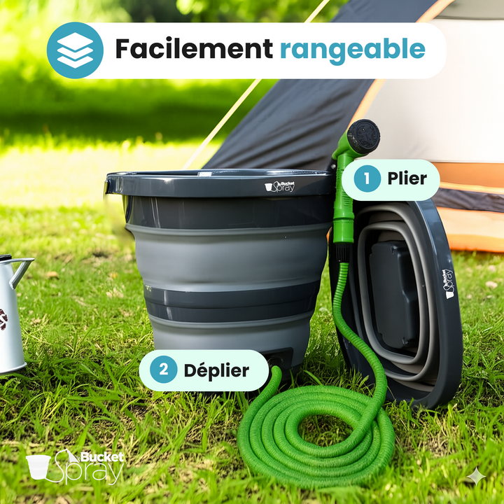 Le seau pulvérisateur pliable Bucket Spray offre un nettoyage autonome, avec batterie rechargeable, jet haute pression et capacité 19L. Idéal pour le jardin, le camping ou le lavage de voiture.